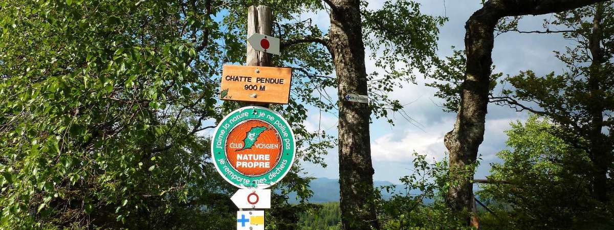 La Chatte Pendue culmine à 899 m, d'où l'on peut embrasser une superbe vue sur le massif du Champ du feu, le Climont et le Donon. Mais l'originalité du lieu réside surtout dans son appellation insolite qui a fait l'objet de nombreuses interprétations. Appelée autrefois "Pirre hhatte pendaïe", Pierre haute pendue. La prononciation gutturale du « H » ou des erreurs de transcription auraient transformé la hhatte en chatte. C'est ainsi qu'en 1847, une belle carte manuscrite des Eaux et Forêts mentionne la Pierre de la Chatte Pendue.